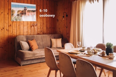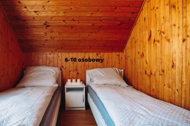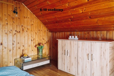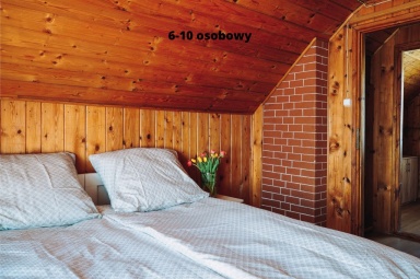 Domek 6-10 osobowy jest piętrowy, drewniany. Wnętrze: