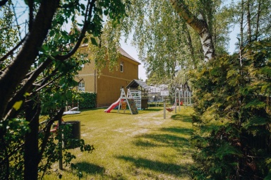 Cały teren jest ogrodzony, dużo zieleni (trawniki, grusze, jabłonie).