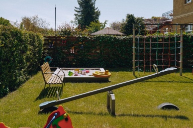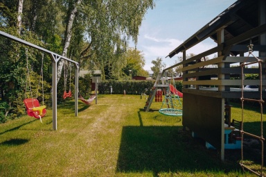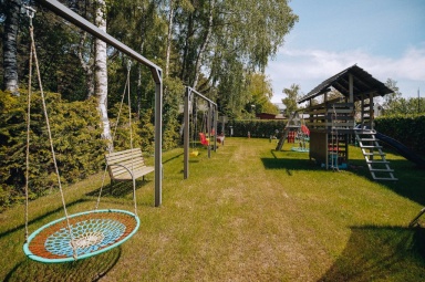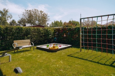-nowy plac zabaw (trampolina, bujak na sprężynie, piaskownica, dwie zjeżdżalnie, mini ścianka wspinaczkowa, hamak, 2 huśtawki bocianie gniazdo, gra kółko- krzyżyk, 2 tradycyjne huśtawki, tablica do rysowania kredą)