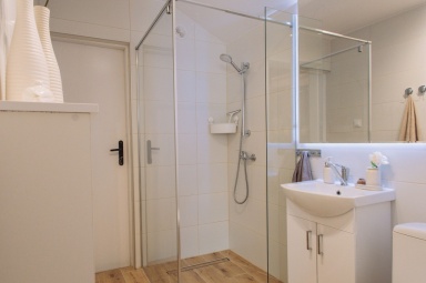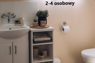 -łazienka - kabina prysznicowa, wc, szafka łazienkowa z umywalką, lustro. Uwaga: wejście do łazienki przez pokój na dole lub od zewnątrz z ogródka.