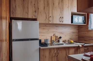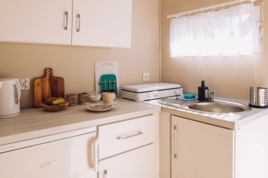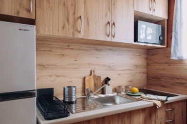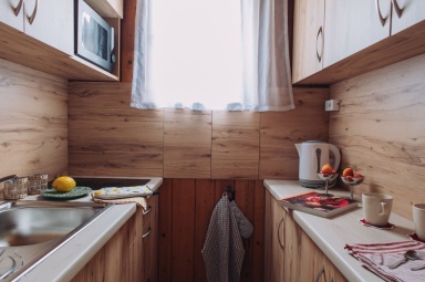-kuchnia- lodówka z zamrażalnikiem, kuchenka gazowa, zlewozmywak, czajnik elektryczny, pełne wyposażenie naczyń, sztućców, garnków, patelni i akcesoriów kuchennych, ścierki i gąbki kuchenne, płyn do mycia naczyń,
