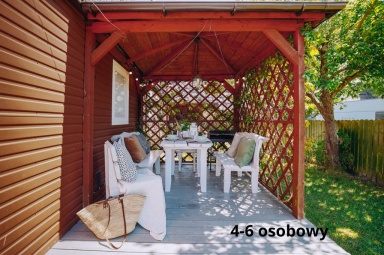 - oświetlony taras z drewnianą altaną, meblami ogrodowymi i grillem.